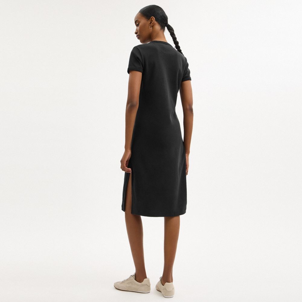 1990年代に着想を得たTシャツドレス。コーチのアイコニックなロゴとカリフォルニアのサーフカルチャーが融合した、遊び心あふれるグラフィックが目を引きます。柔らかいコットン素材で仕立てたロングシルエットに、片側にサイドベントの入った動きやすいスタイルです。