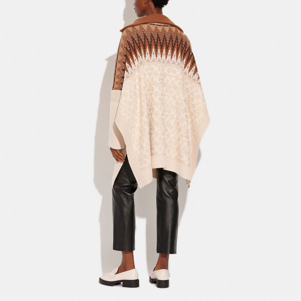 レイヤードしやすい極柔のポンチョ。暖かいウールとラグジュアリーなカシミヤをブレンドしました。コーチのシグネチャーと冬のフェアアイル柄をあしらった、心地よいオーバーサイズのデザイン。襟はハーフジップのタートルネック、サイドにスリットの入った動きやすいスタイル。トリムはリブ編み仕立てです。