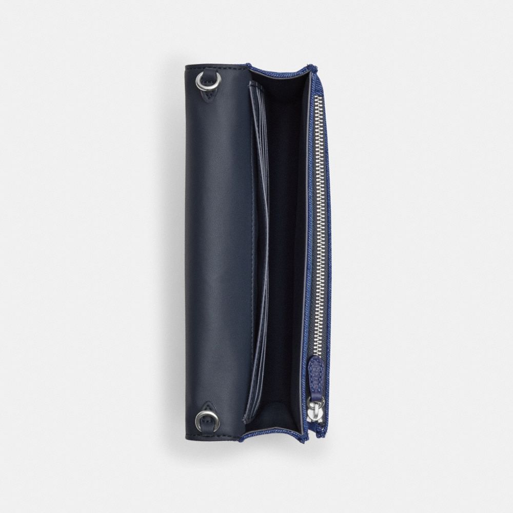 ブランドの上質な革によるミニバッグ(斜めがけバッグ) デニム、リファインド ペブル レザー カードスロット x 8 札入れ(折らずに収納可能) 内側にジップ ポケット 外側にスリップ ポケット スナップ開閉 取り外し可能ストラップ、肩から本体までの長さ58.5cm(ショルダー&斜め掛けの2WAY仕様) ※お好みで別売りストラップに付け替えてアレンジ可能。