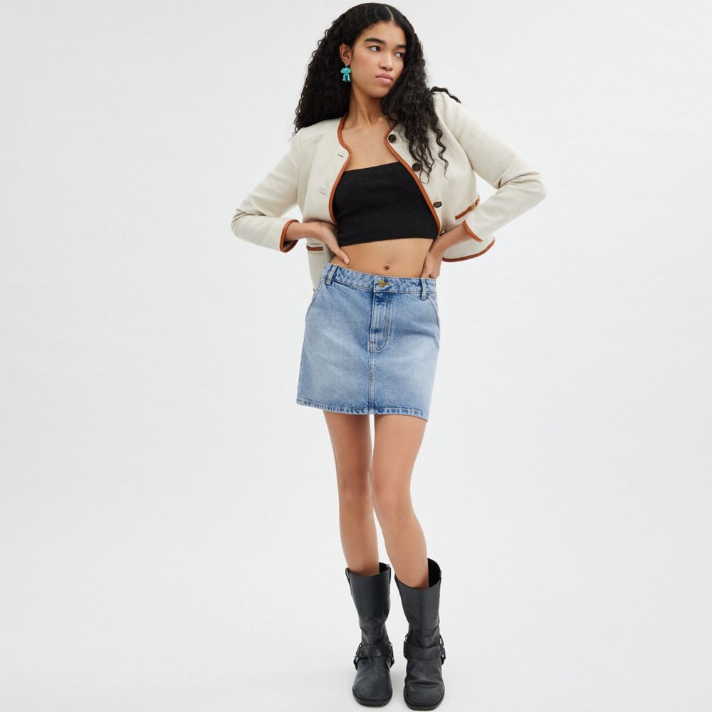 オールシーズン活躍してくれる、クラシックなAラインシルエットのミニスカート。コットンデニムのデザインに、背面ポケットのシグネチャー パターンとウエストバンドのレザーパッチがさりげなくクラシックな雰囲気を添えます。