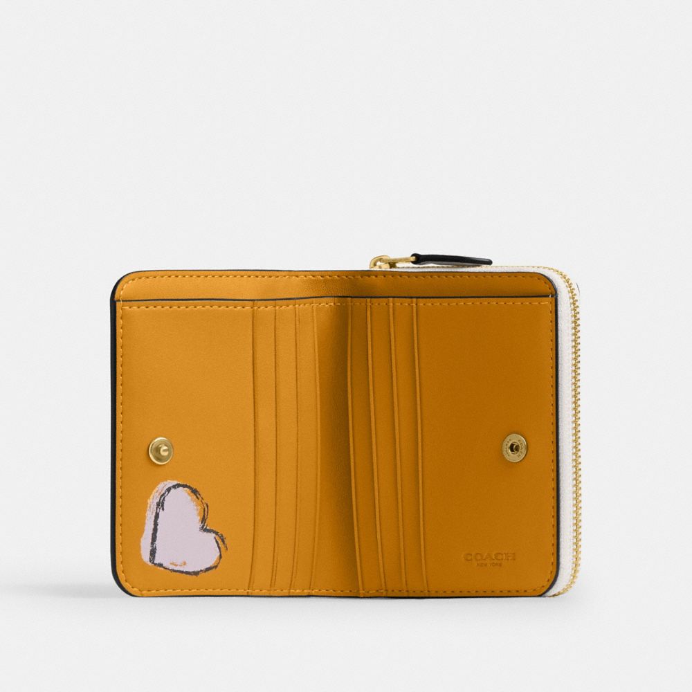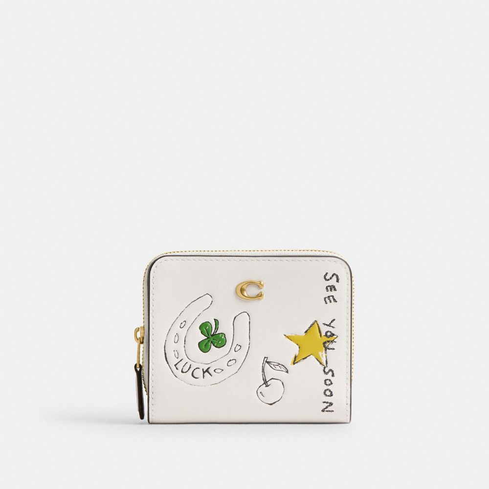 リファインド レザーの二つ折りミニ財布。マーカーペンや絵の具を使って描かれたコーチのホームであるニューヨークのシンボルやアメリカンカルチャーのスケッチ プリントが、プレミアムな雰囲気を演出します。