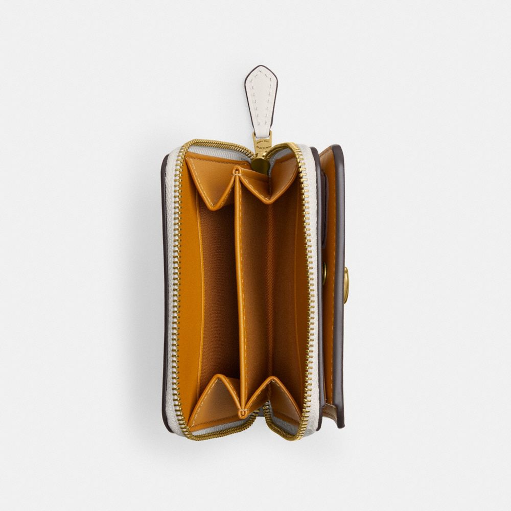 コーチの“C”のハードウェアがクラシックな雰囲気。3辺に大きく開く小銭ポケットは、レシートやイヤフォンの収納にも便利な仕切り付き。スナップを外すと、8層のカードスロットと札入れが広がります。