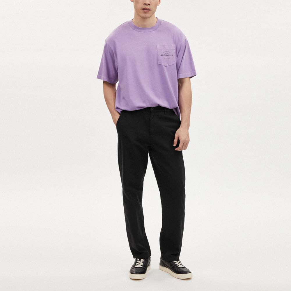本体:100% コットン ポケット裏地:77% コットン、23% ポリエステル レザートリミング:牛革 飾り部分を除く 裏地:無し ウエスト後ろゴム仕様 フロント両脇スリップポケット、後ろ左右ボタンポケット ジップ開閉、ボタン開閉 伸縮性:斜めストレッチ サイズS:ウエスト74cm、ヒップ98cm、股上28cm、股下79cm、もも幅32cm、裾幅19cm サイズM:ウエスト81cm、ヒップ104cm、股上29cm、股下79cm、もも幅34cm、裾幅20cm サイズL:ウエスト88cm、ヒップ110cm、股上30cm、股下79cm、もも幅36cm、裾幅21cm※画像や動画は実際の商品と色味、仕様、サイズ等が若干異なる場合がございます。