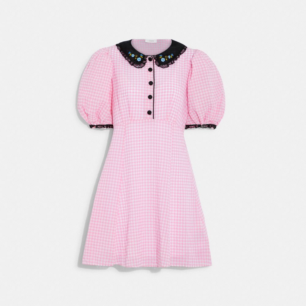 ギンガムチェックのベビードールドレス。1930~1940年代のシルエットに着想を得た、軽やかなコットン スタイルです。可憐なフローラルのレース刺繍のディテールが目を引きます。パフスリーブとバスト下で切り替わるエンパイアウエストをあしらった、動きやすいデザインです。