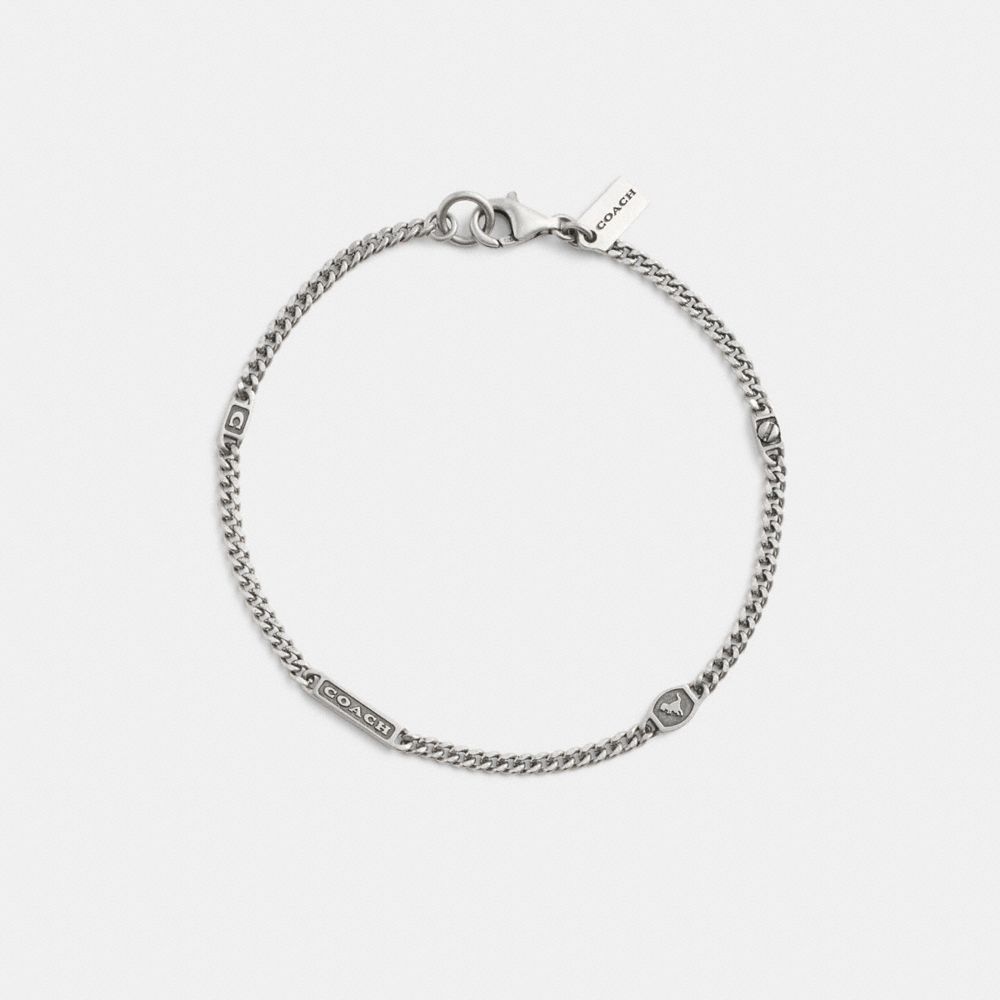 コーチのアイコニックなモチーフをあしらった、スターリングシルバーのカーブチェーン ブレスレット。メンズ ジュエリー コレクションのアイテムです。つけ外しが簡単なクラスプ開閉式。ご自分用はもちろん、お祝いやギフトにもおすすめです。