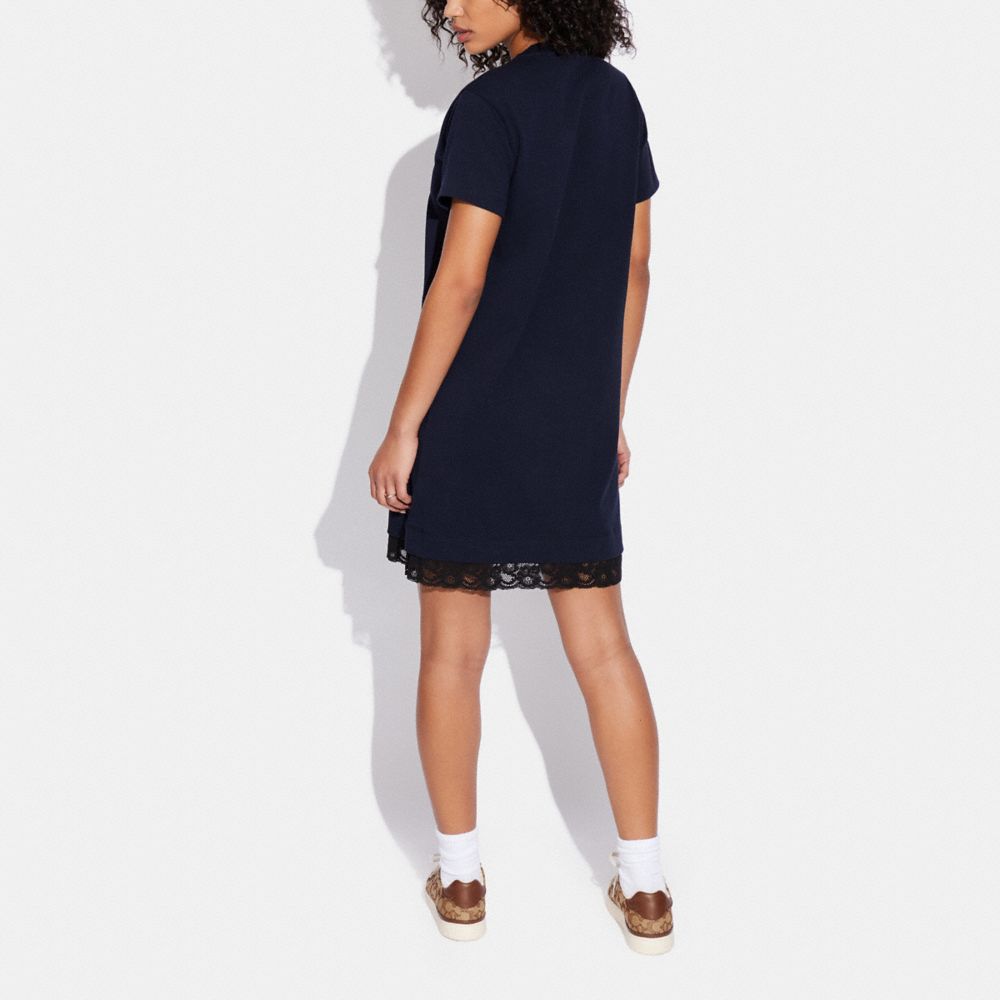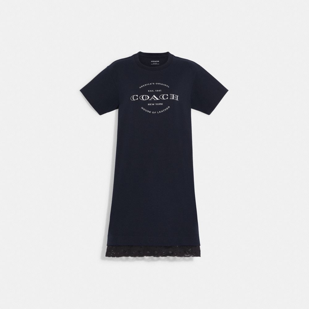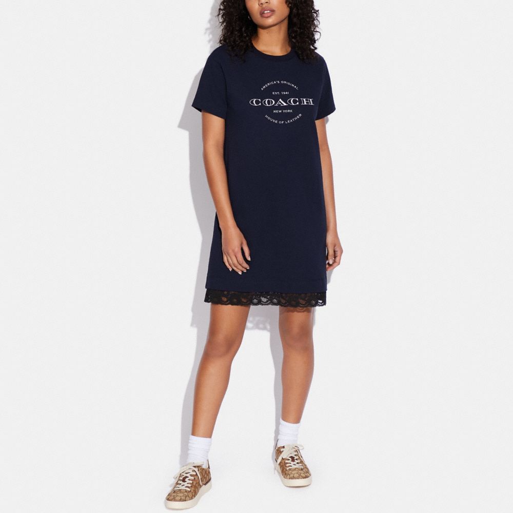 裾レースが目を惹くジャージー ドレス。刺繍されたコーチロゴが胸元を飾ります。