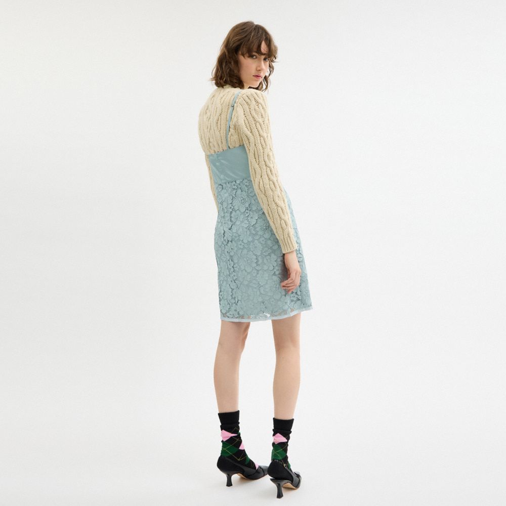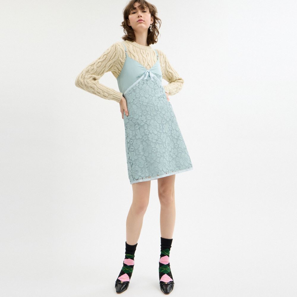タフタとレースを組み合わせた、パーティにぴったりなVネック スリップドレス。愛らしいリボンのディテールが目を引く、繊細なデザインが魅力です。フルライニングを施した背面ジップ開閉のフェミニンな膝下丈のスタイル。ストラップでお好みのフィット感に調節できます。