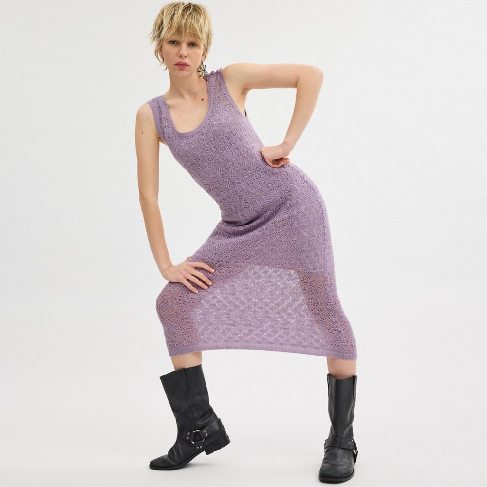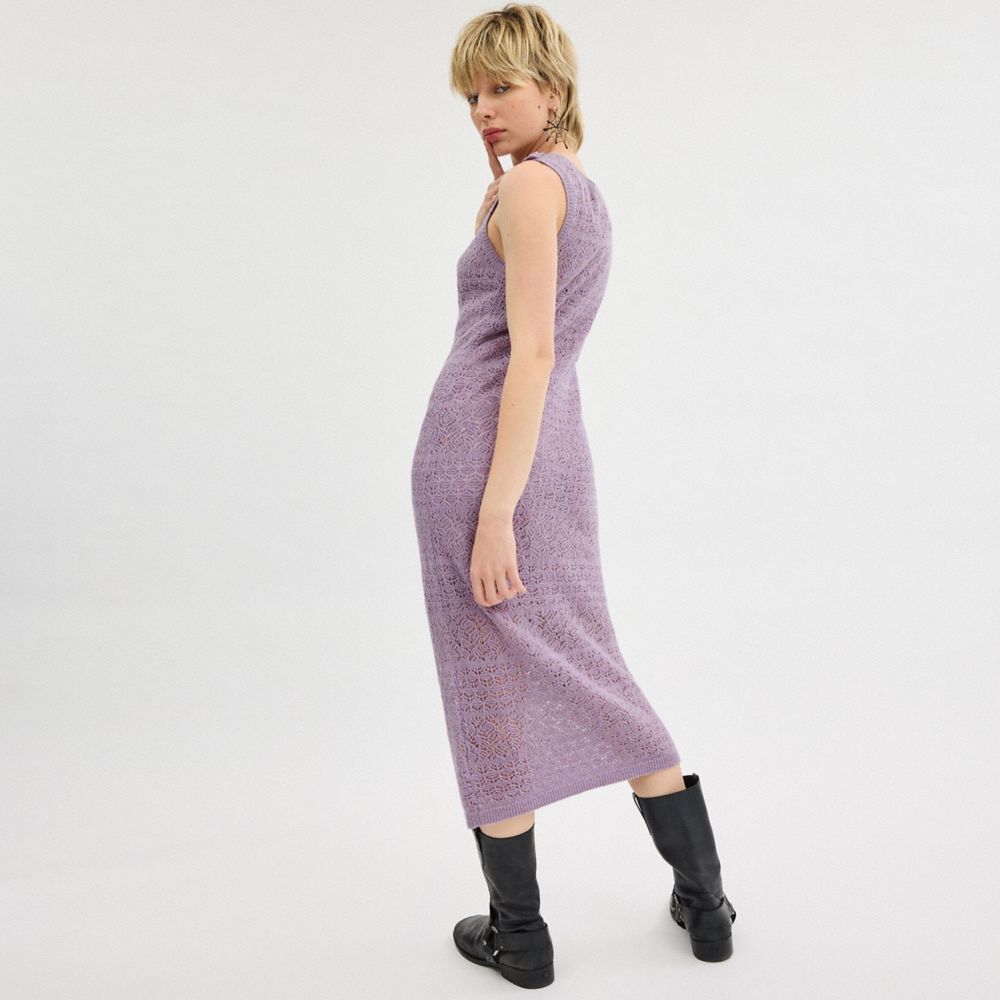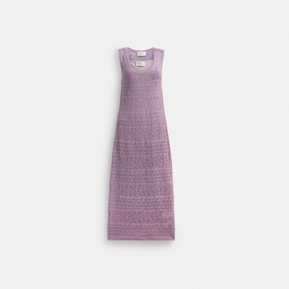 オープンニットのレース柄の繊細なデザインをあしらった、ミディ丈のスクープネック ドレス。肩にあしらったコーチの“C”のボタンが、さりげなくクラシックな雰囲気を添えます。付属のミニ丈のインナードレス付き。