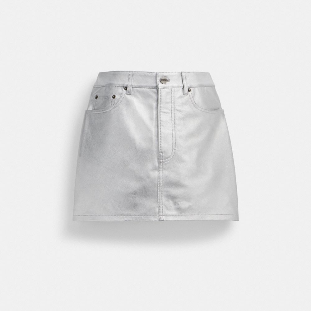 お気に入りのデニム スカートのようなルックスと履き心地。装いに煌めきを添える、しなやかなメタリック レザーで仕立てました。ややAラインのミニ スカートです。