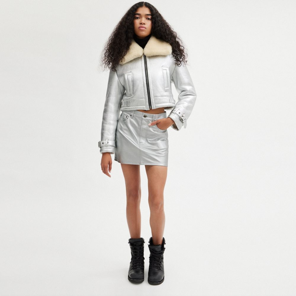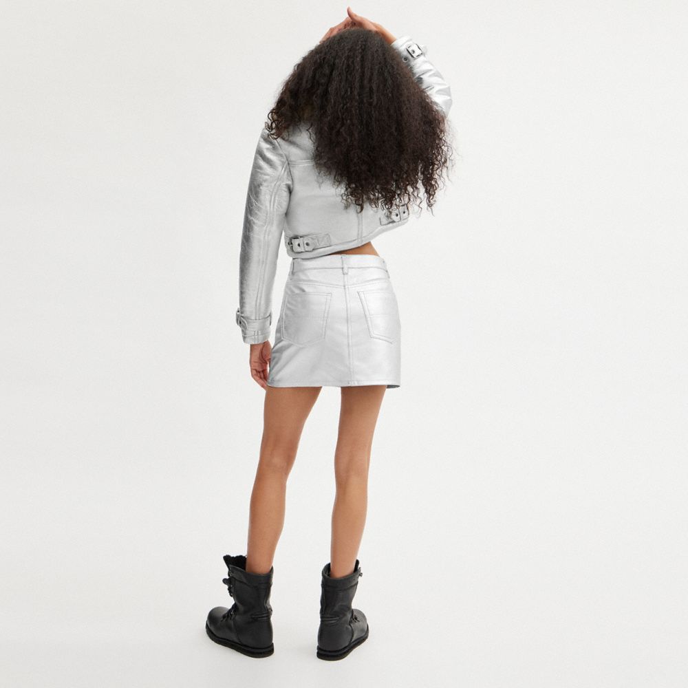 お気に入りのデニム スカートのようなルックスと履き心地。装いに煌めきを添える、しなやかなメタリック レザーで仕立てました。ややAラインのミニ スカートです。