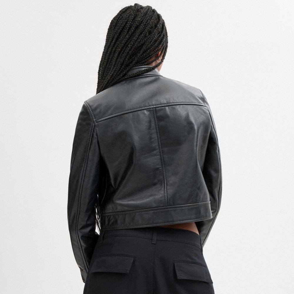 装いを高めてくれる、リュクスなレザージャケット。クラシックなレーサージャケット風のクロップド丈のスタイルに仕立てました。襟元にスナップボタン、ポケットと袖口にはジップ付き。