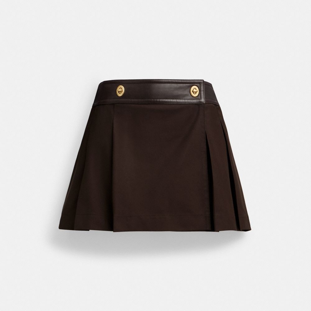 Aライン プリーツ シルエットのラップ ミニスカート。通気性の良いコットン混で仕立てたスタイルに、バターのようにしっとりとしたレザーのリュクスなウエストバンドをあしらいました。ボタンの代わりにコーチのアイコニックなターンロックが個性を放ちます。