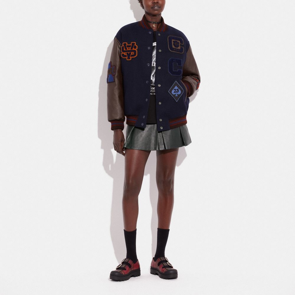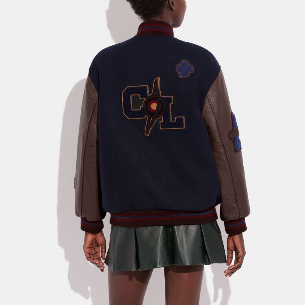 チーム スピリットと真のアメリカンクールを象徴するヴァーシティ ジャケット。再生ウールと再生ポリエステルで仕立てました。地球環境への影響を抑えるコーチの取り組みが原点にある、「コーチ フォーエバー コレクション」の一つです。