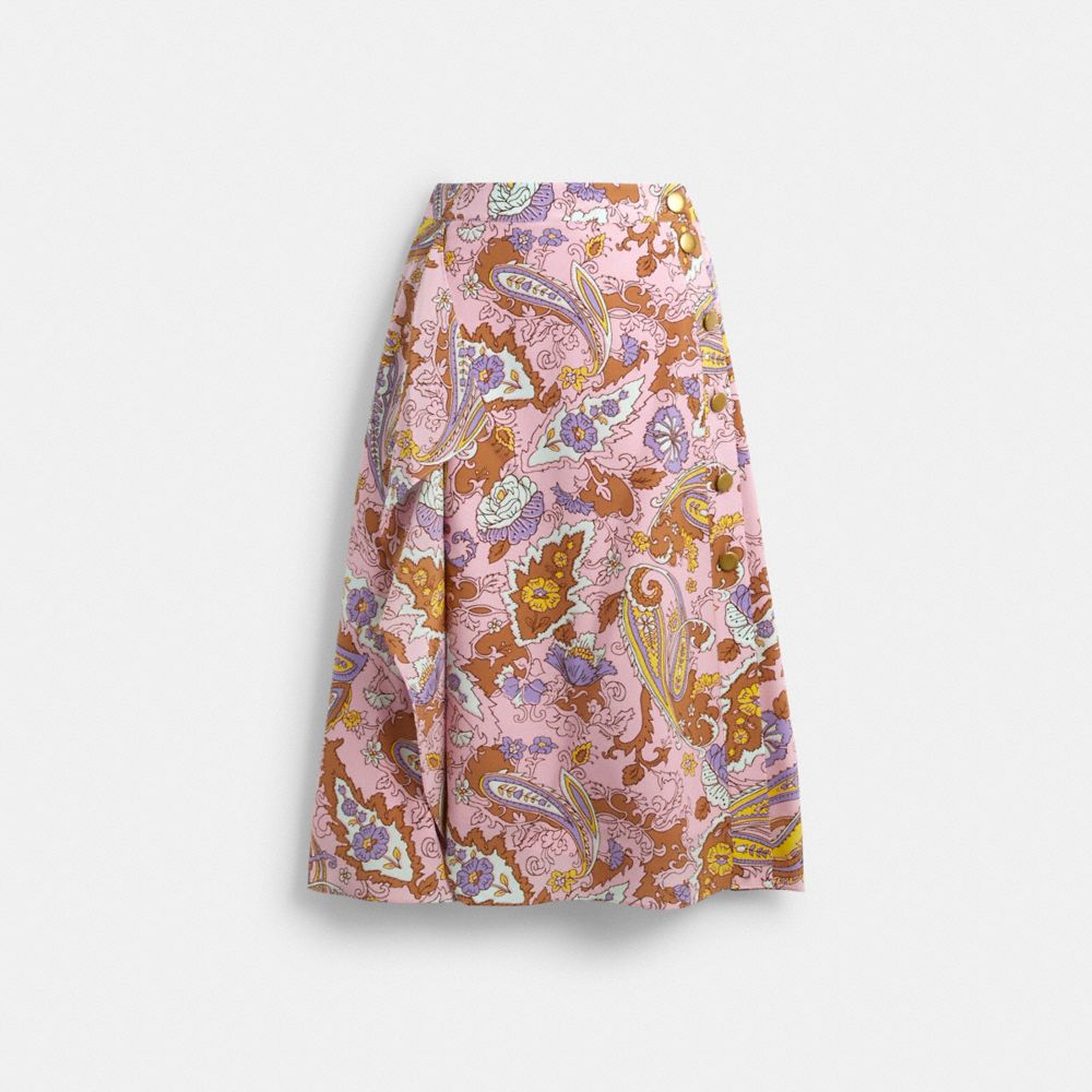 1960年代の洗練されたペイズリー プリントが華やかなシルクのスカート。フロントのカスケード ラッフルがひときわエレガント。長めのシルエットのサイドシームに真鍮ボタンをあしらい、フロントベントの入った動きやすいスタイルです。
