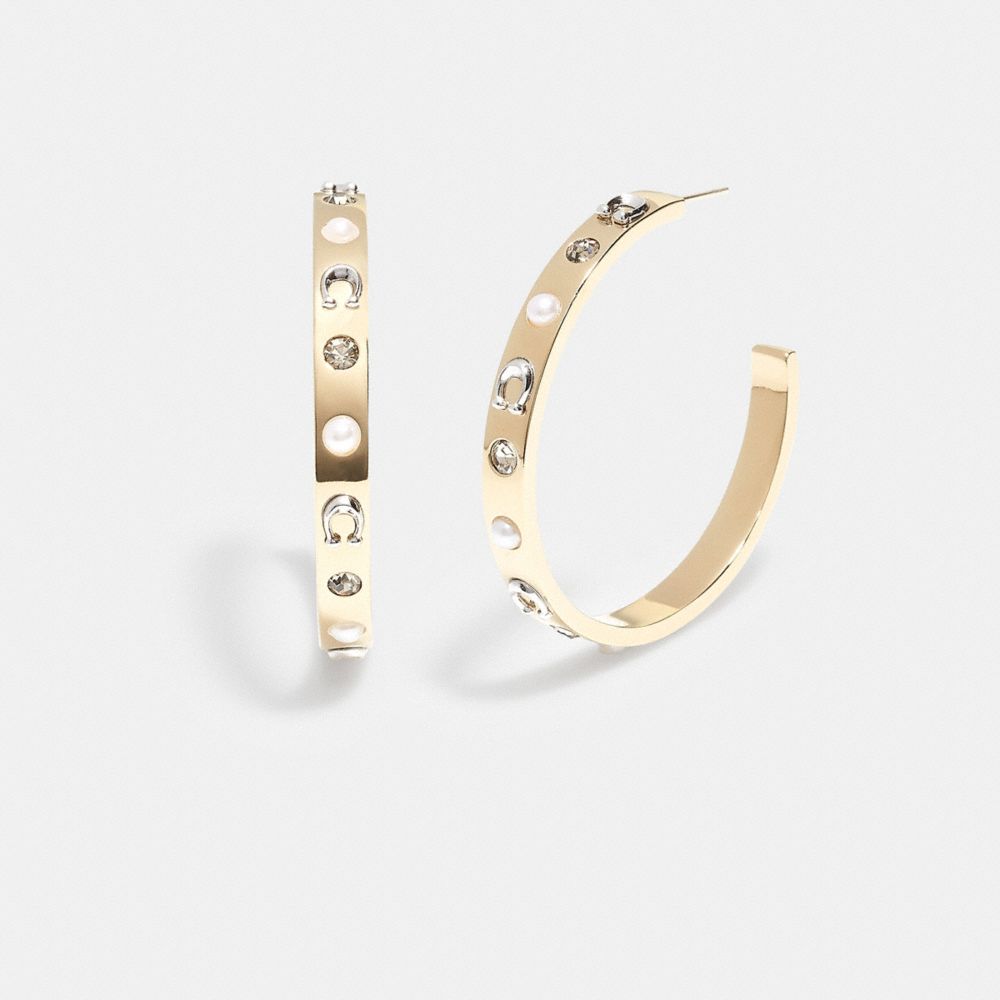 滑らかな光沢を放つ、大ぶりのフープ ピアス。煌めくクリスタルとコーチのシグネチャーがヘリテージな雰囲気を演出する、ミニマルデザインのエレガントなスタイルです。