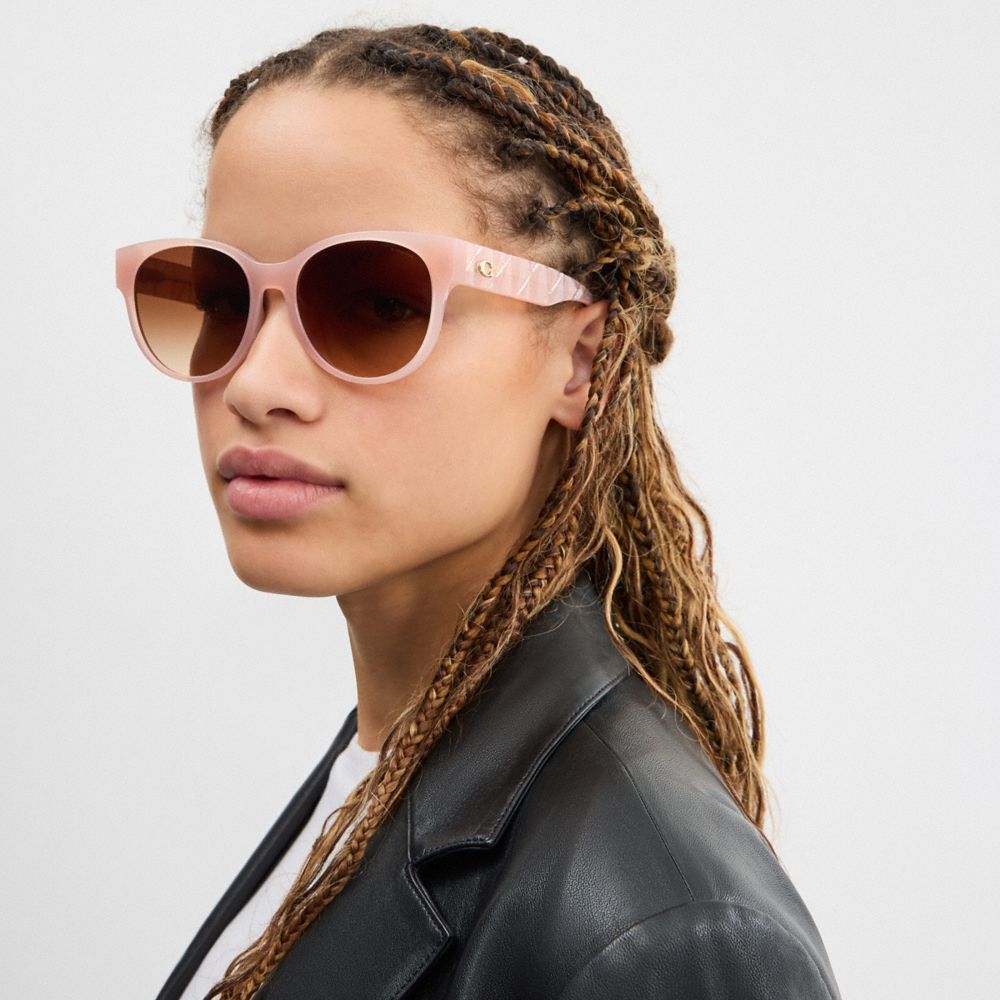 日常に魅力をもたらしてくれる、丸みを帯びたキャットアイ サングラス。コーチのハンドバッグのデザインをモチーフにしたキルティングのディテールをアームに施しました。ポリッシュ仕上げのコーチの“C”のハードウェアがヘリテージな雰囲気を演出する、軽やかなデザインです。