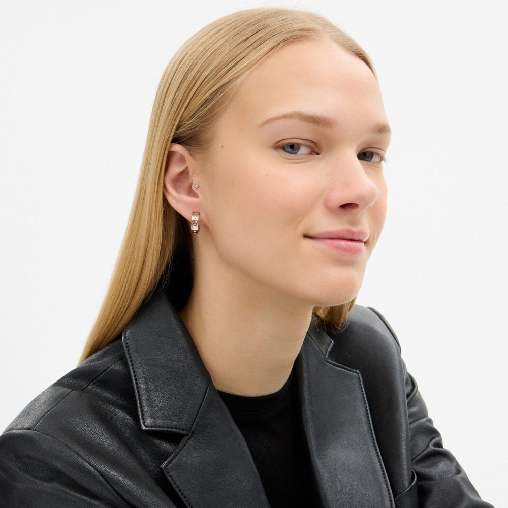シンプルで洗練された印象の、ハギータイプのフープ ピアスです。クリスタルの輝きがさりげないアクセントです。