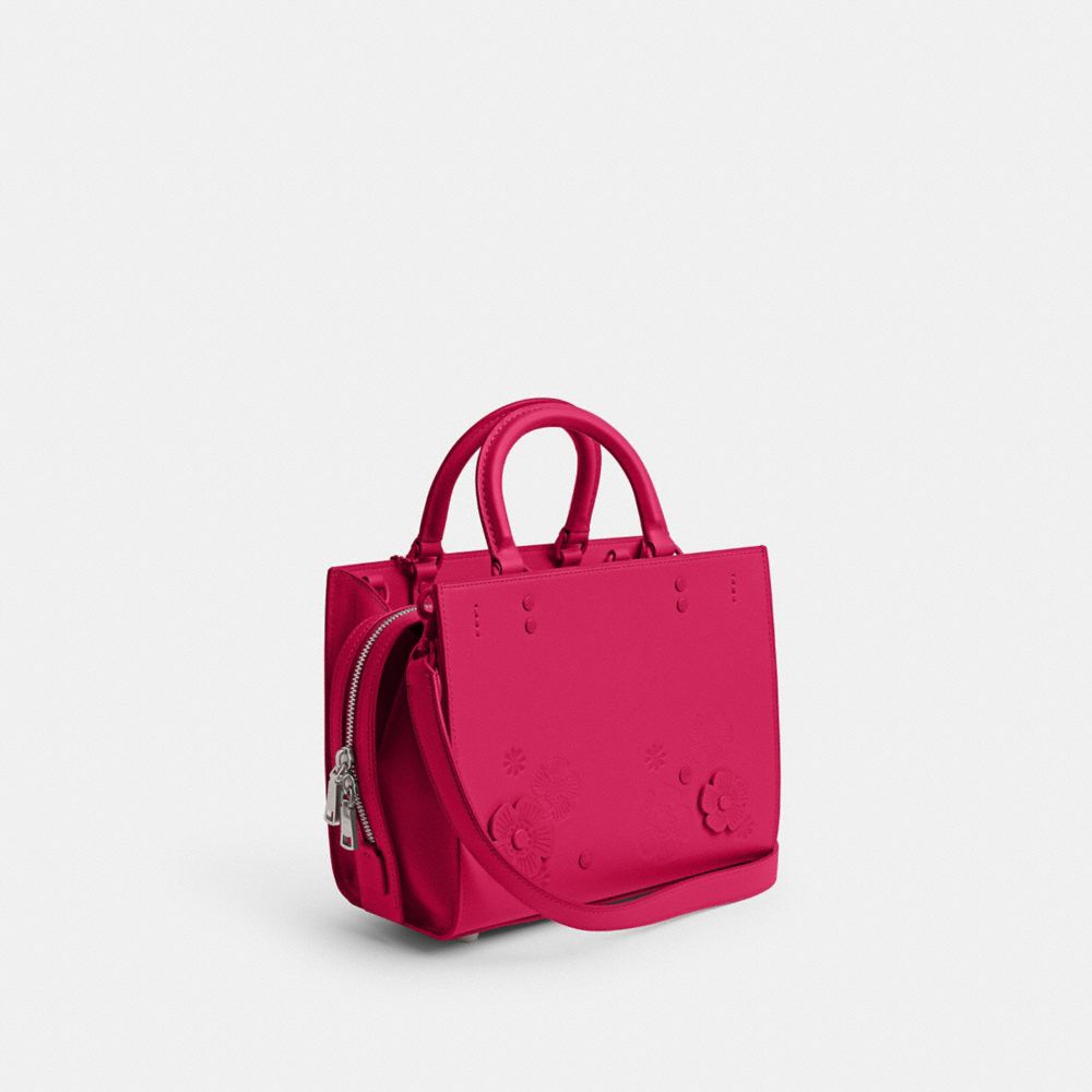 デボス加工された花びらの形に打ち抜かれて職人の手によって一枚ずつ取り付けられた、ティーローズのモチーフ。サイズ違いの花びらを3時間かけて立体的に立体的に飾りつけました。ローグの代名詞でもあるラゲージ ハンドルを使ってハンドバッグとして、付属のストラップを使って肩掛けや斜め掛けとしてもお楽しみいただけます。