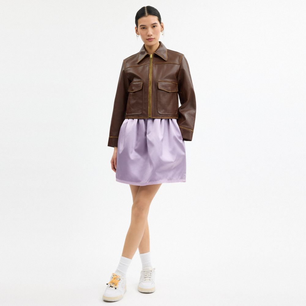 クラシックなアビエータージャケットをモダンにアップデートした、シュランケンフィットのジャケット。レザーで仕立てたクロップド丈のシルエットに、ポインテッドカラーとフラップポケット付き。