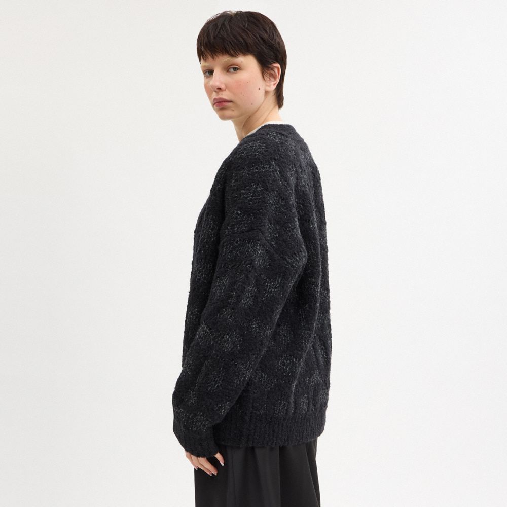 定番スタイルにコーチのシグネチャー パターンを添える、チャンキーニットのVネックカーディガン。柔らかいウール混でコーチのアイコニックなシグネチャー パターンに編み上げ、リブ編みのトリムで仕上げました。多彩なレイヤードをお楽しみいただける、リラックスフィットのシルエットです。
