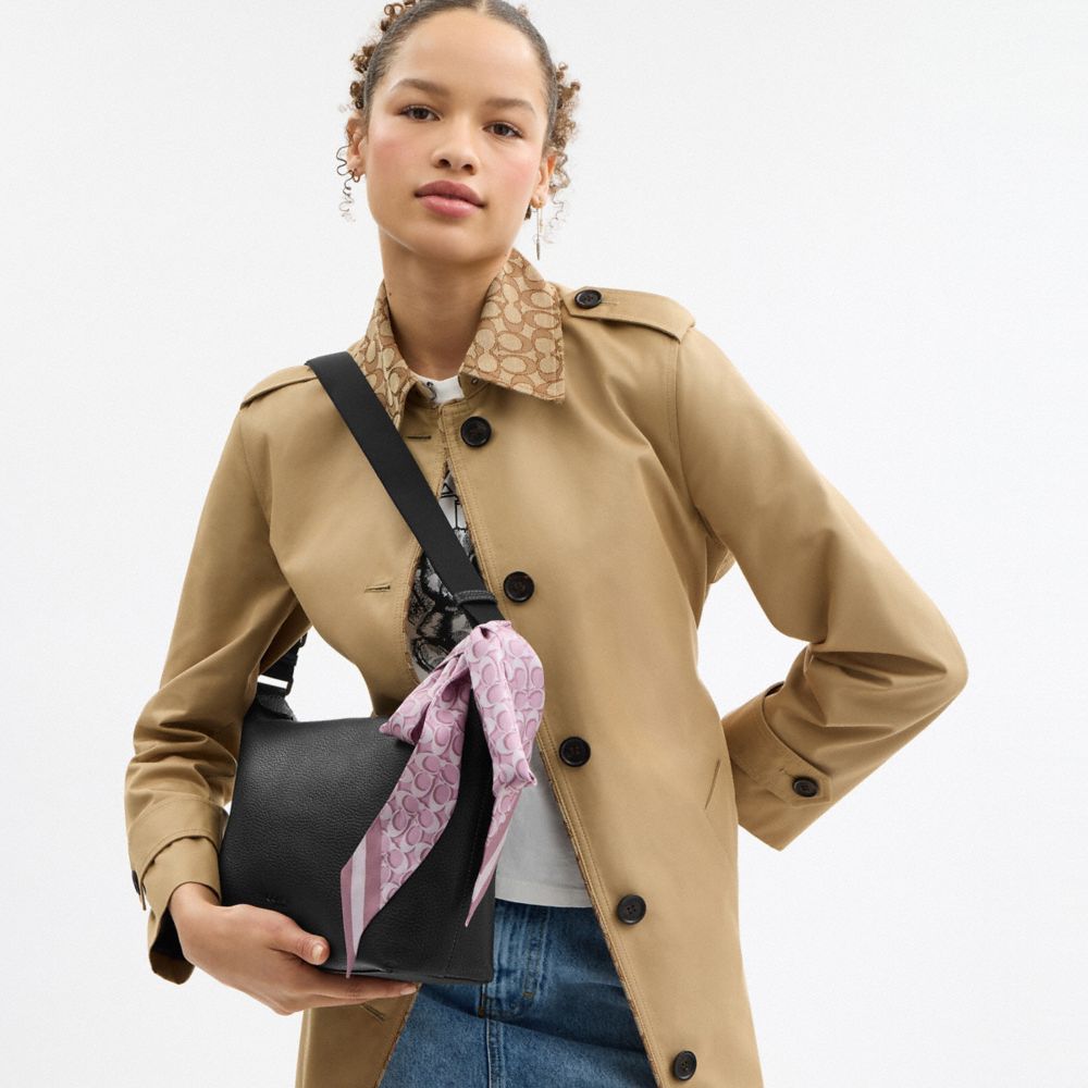 軽やかな細身のスカーフ。襟元に巻いたり、またはお気に入りのバッグに結び付けて個性を演出して。