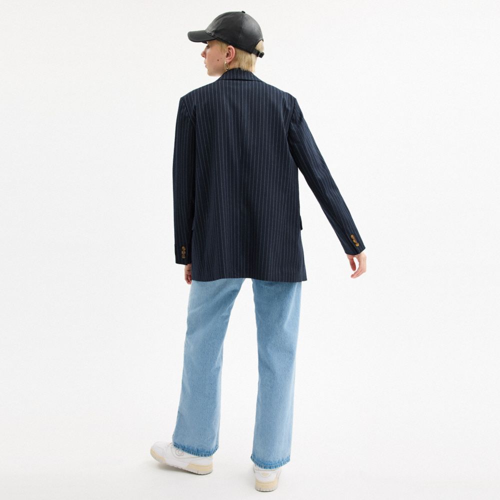 ビジネスにも休日にも活躍する、ピンストライプ柄のシングルブレスト ブレザー。着心地のよいリラックスフィットのデザインにフラップポケット、左の袖にテーラードタグをあしらいました。バックベントの入った動きやすいスタイルです。単体での着用はもちろん、お揃いのスカートを合わせて、コーディネート ルックを楽しんでみても。