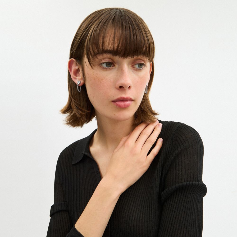 いつもの装いにさりげない魅力を添える、フロント バック チェーンのピアス。ティーローズのスタッドに煌めくクリスタルがアクセントを添えます。チタン製ポストに、着脱しやすいラウンド型キャッチを採用したポスト&キャッチ式です。