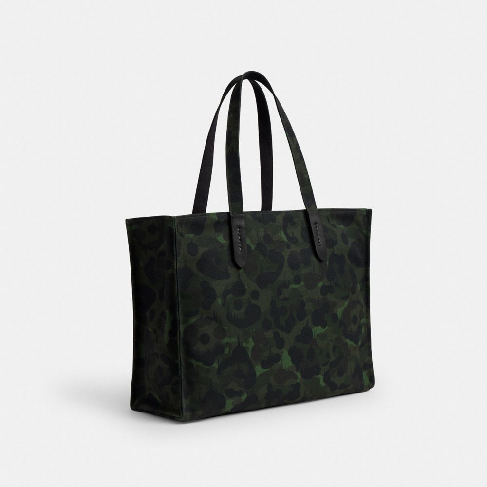 遊び心あふれる実用的なトート。リサイクル ポリエステルを使用した100%リサイクル キャンバスで仕立てました(レザーも50%以上がリサイクル素材)。地球環境への影響を抑えるコーチの取り組みが原点にあるアイテムです。ラギッドな雰囲気のカモ プリントの背景に、コーチのアイコン キャラクターの恐竜<レキシー>が目を引きます。